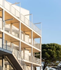 Le bâtiment de 43 logements sociaux s’inscrit dans le nouveau quartier des Ardillos, à Mérignac, dont l'organisation est marquée par un fort contraste entre de grandes venelles piétonnes accueillant de longues coursives d’accès, et des façades plus intimes côté jardins. Une rotation de la trame bâtie du bâtiment permet de profiter au maximum de l’ensoleillement et de générer un ensemble d’inflexions propices à des lieux d’échelle domestique où l’intimité de chacun est privilégiée.