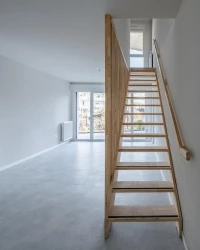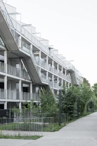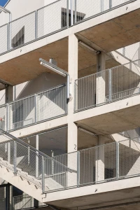 Reposant sur une forte rationalité, le plan offre 100 % de logements traversants et des duplex au rez-de-chaussée reconstituent l’échelle de maisonnettes autonomes.