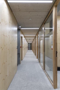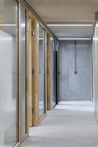 La lumière naturelle inonde les parties profondes du plan au travers des cloisonnements vitrés des bureaux.