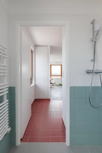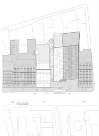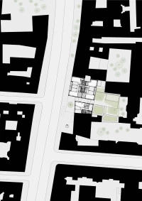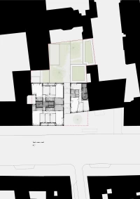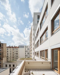 La faille créée entre les deux nouveaux édifices est un espace de desserte, c’est aussi l’occasion d’offrir de multiples orientations aux logements et de donner à voir aux passants une transparence vers un cœur d’îlot arboré.