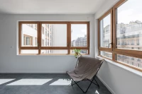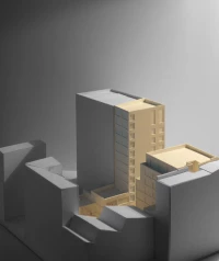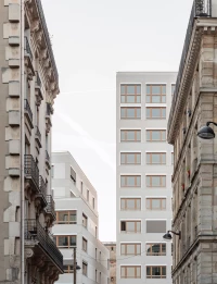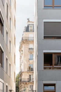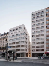 Dans un contexte d’avenue parisienne constituée, la parcelle se situe à l’interface entre 2 logiques antagonistes : celle d’un immeuble à l’alignement typiquement Haussmannien, et celle d’une tour des années 70, en retrait par rapport à la voirie. Dans ce contexte, le projet prend le parti de réconcilier les deux systèmes urbains en place. Deux édifices distincts séparés par une faille et respectivement accolés aux héberges voisines sont proposés.