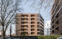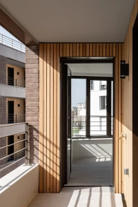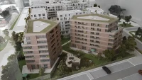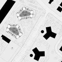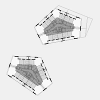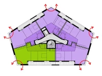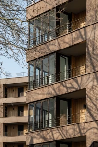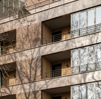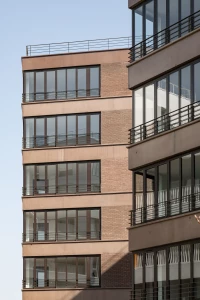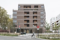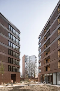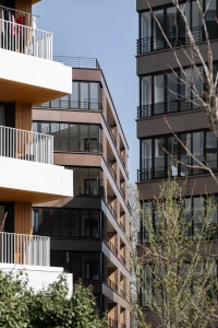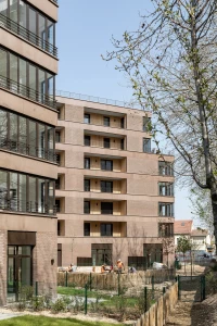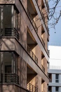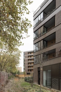 Ce projet de 77 logements au sein du quartier des Pantinoises prend la forme de 2 plots pentagonaux. Cette géométrie permet d’offrir 100 % de logements avec salons d’angle, un à chaque pointe du pentagone. Double exposées, ces pièces sont largement vitrées à la façon d’ateliers d’artistes. Le béton est ici limité à la structure primaire ( poteaux, dalles, bandeaux) alors que les façades sont composées de maxibrique brune posée en maçonnerie classique et autoporteuse.