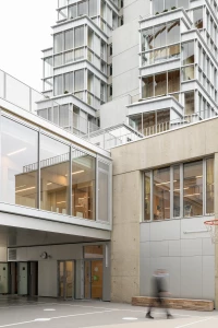 Cette école polyvalente de 8 classes constitue le socle d’un îlot mixte et métropolitain (logements, équipement, commerces, activités) du secteur Bruneseau à Paris 13e. Le groupe scolaire est composé de trois volumes distincts en béton sablé, reliés par un «bâtiment-pont» accueillant la bibliothèque, toute en transparence, offrant des vues lointaines aux petits usagers la pratiquant. La cour est conçue comme un lieu préservé des nuisances de la rue, riche de ses interactions avec les salles de classe et le centre de loisir.