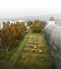 S’inscrivant dans le cadre d’une nouvelle réflexion sur l’extension de la Commune de St Pierre en Faucigny, le projet propose la requalification de la place centrale existante articulant l’Eglise, la Mairie et un nouvel équipement communal. Reprenant le principe parcellaire des lanières agricoles présent en coeur de Bourg, un nouvel espace vert transversal est créé. Libéré de toute construction, il constitue un équipement de loisir, support d’usages festifs, sportifs ou agricoles. Perpendiculairement à cet axe sont disposés, suivant les principes bioclimatiques, des logements intermédiaires en lanières.